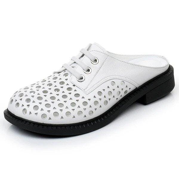 Cave shoes real leather flat heel thick sole hollowed out sandals women's slippers round toe
