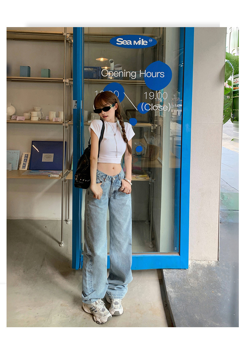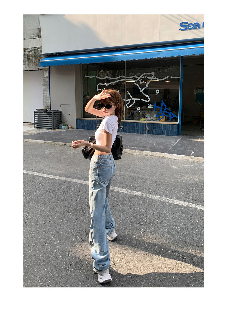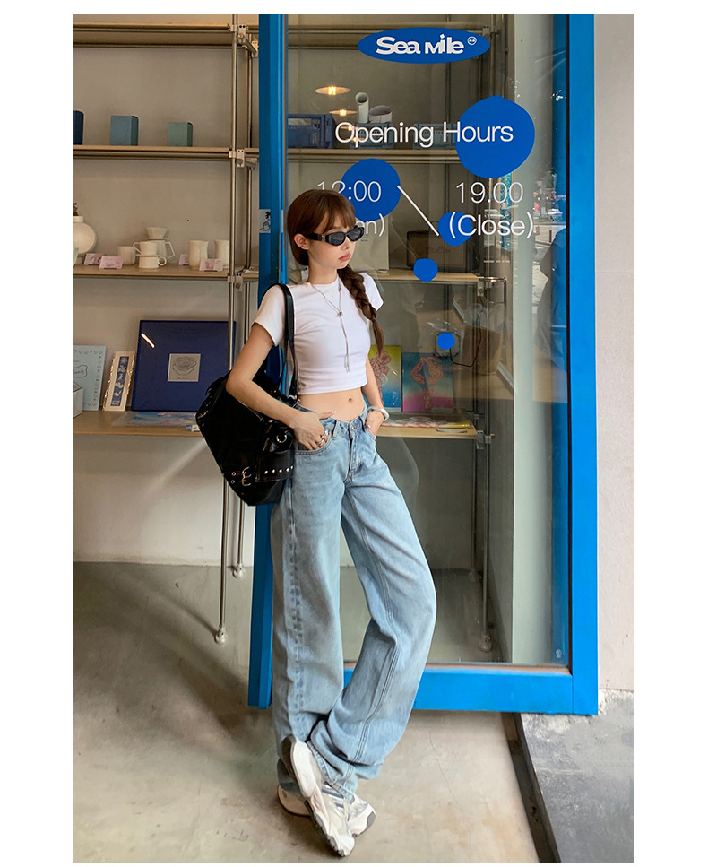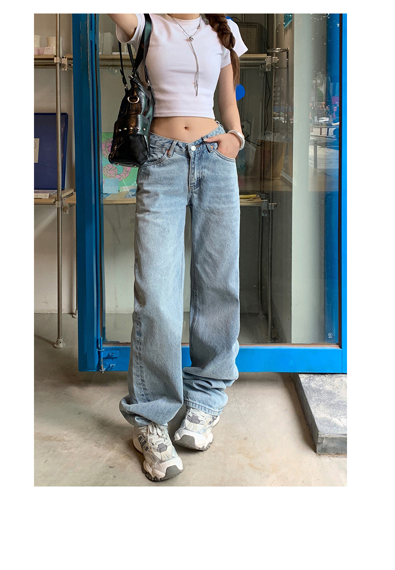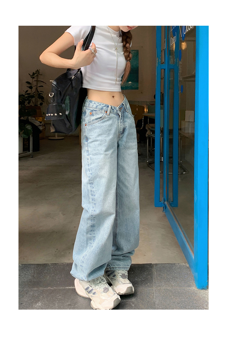 Washed Blue V-neck Waist Straight Leg Jeans Women Loose Slimming High-waisted Versatile Drape Floor-length Pants