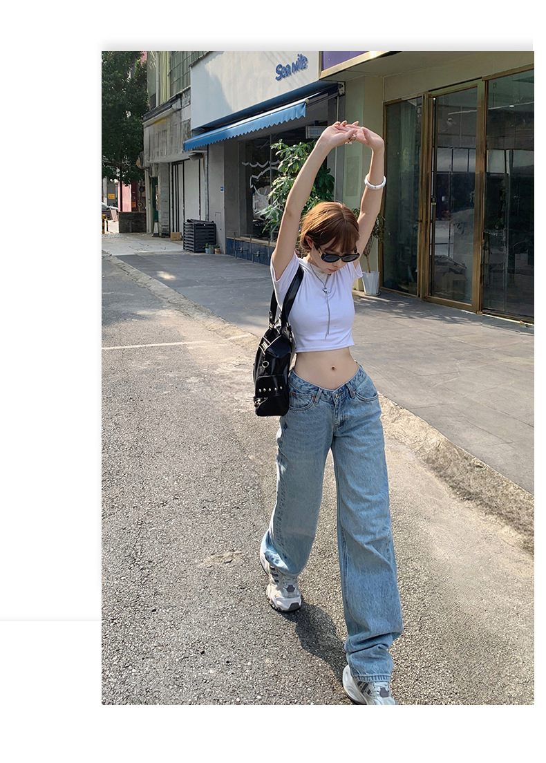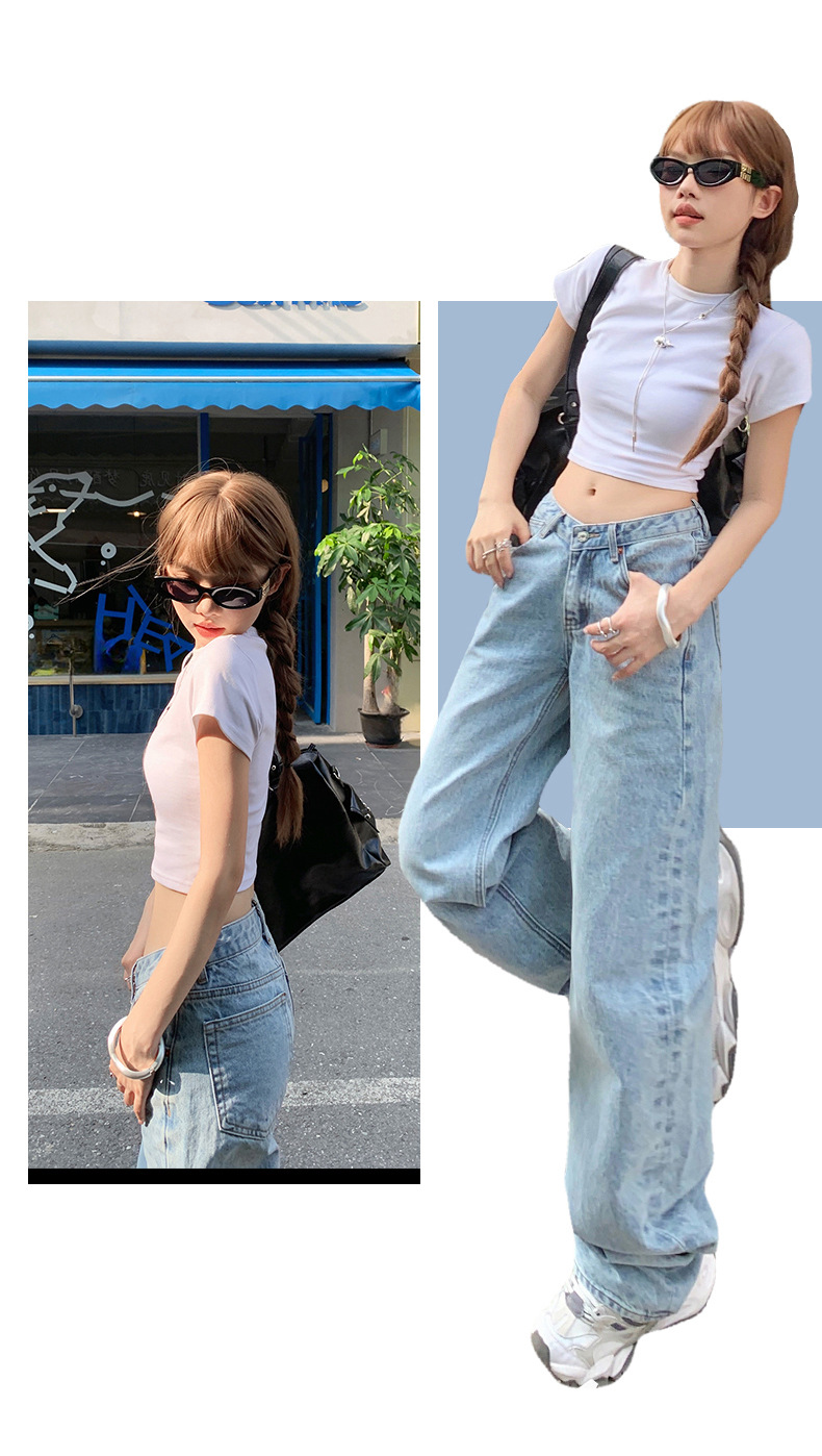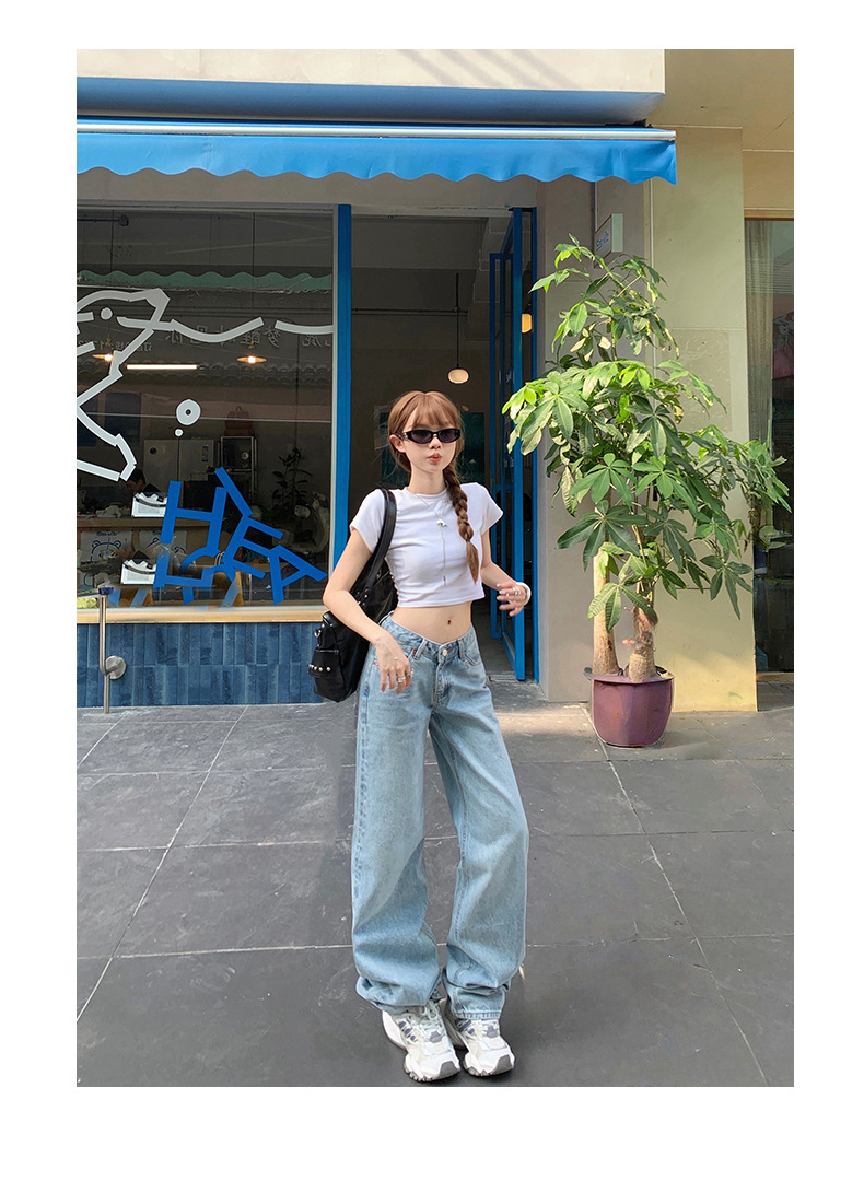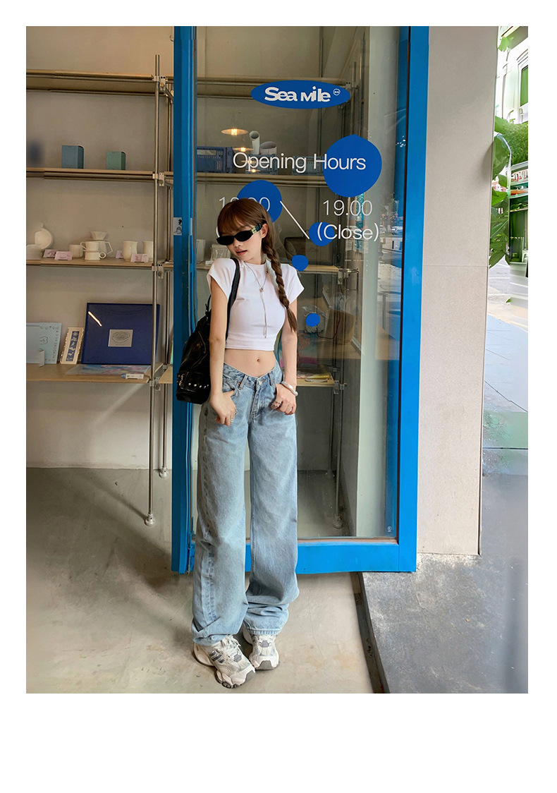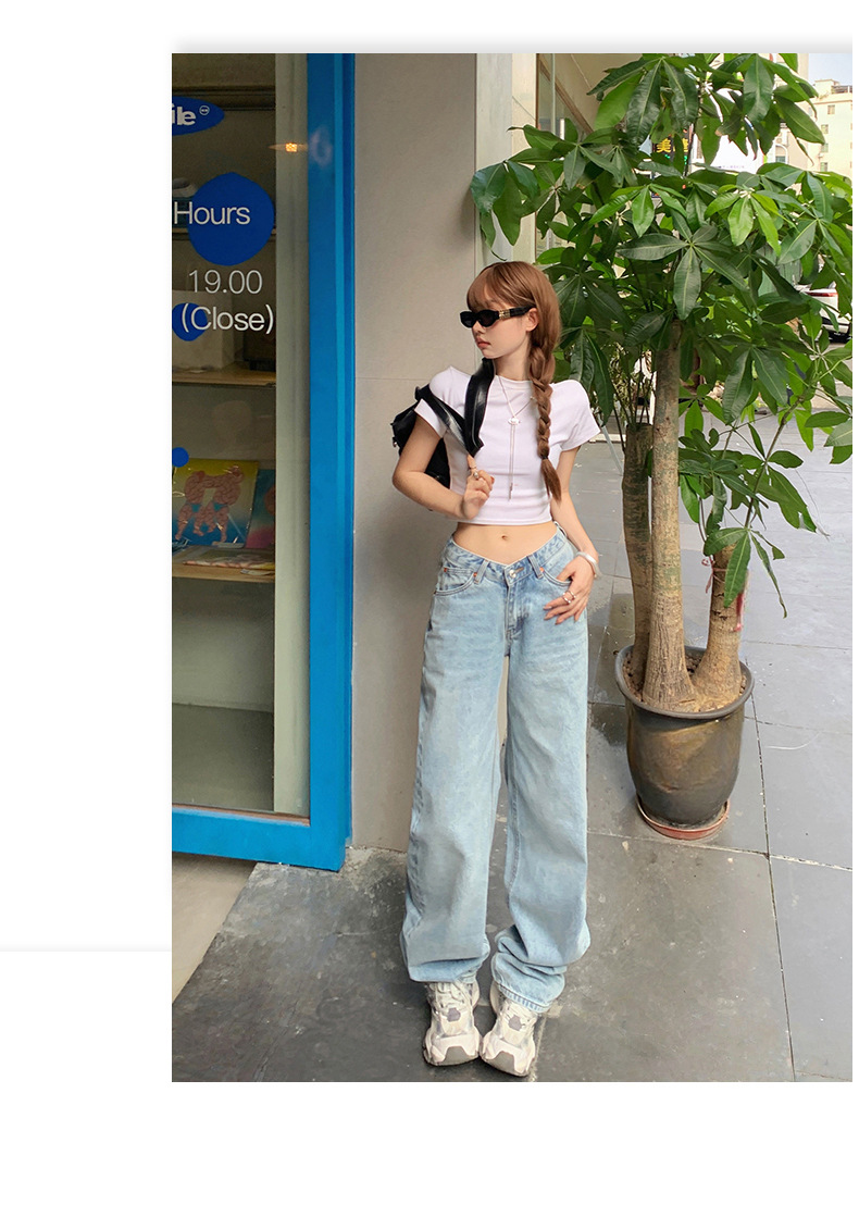 Washed Blue V-neck Waist Straight Leg Jeans Women Loose Slimming High-waisted Versatile Drape Floor-length Pants