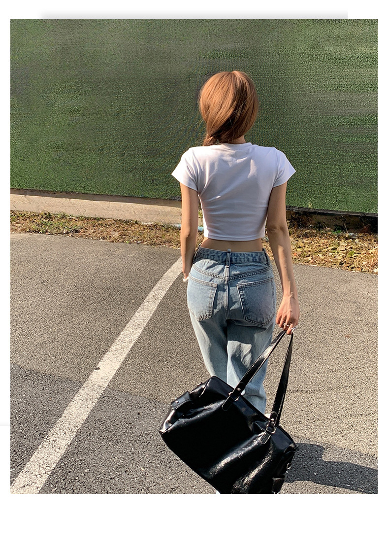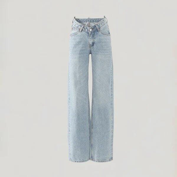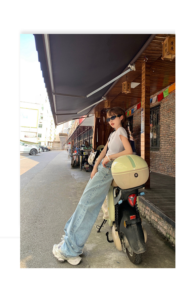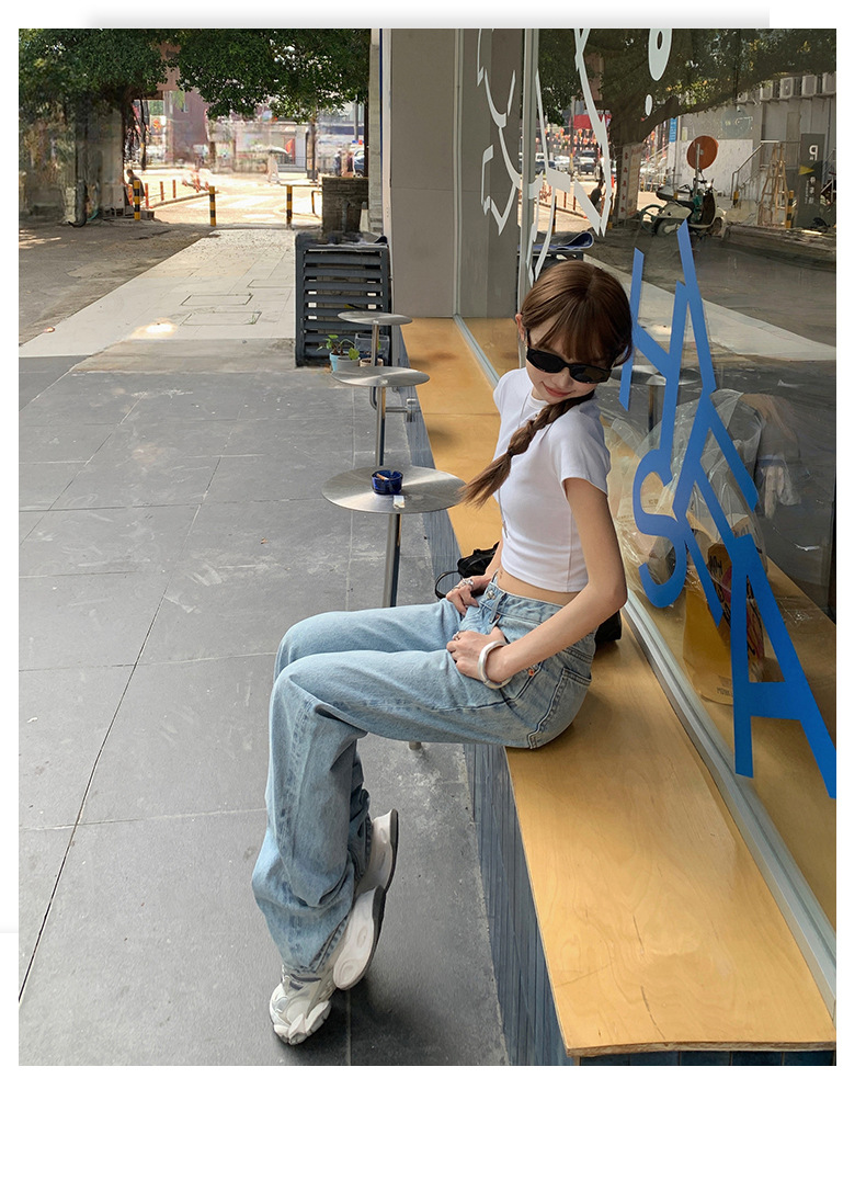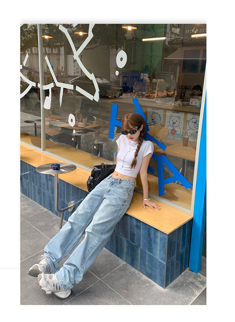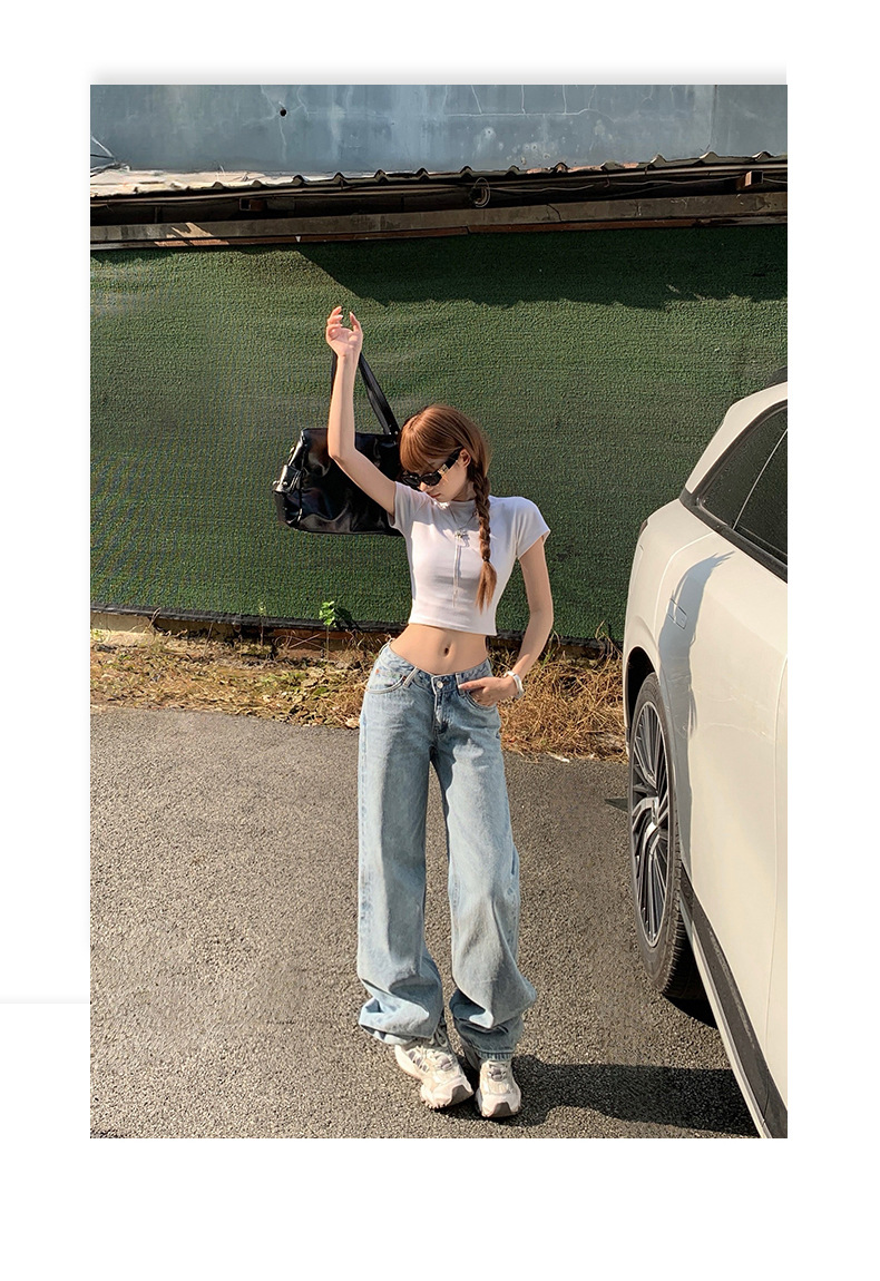 Washed Blue V-neck Waist Straight Leg Jeans Women Loose Slimming High-waisted Versatile Drape Floor-length Pants
