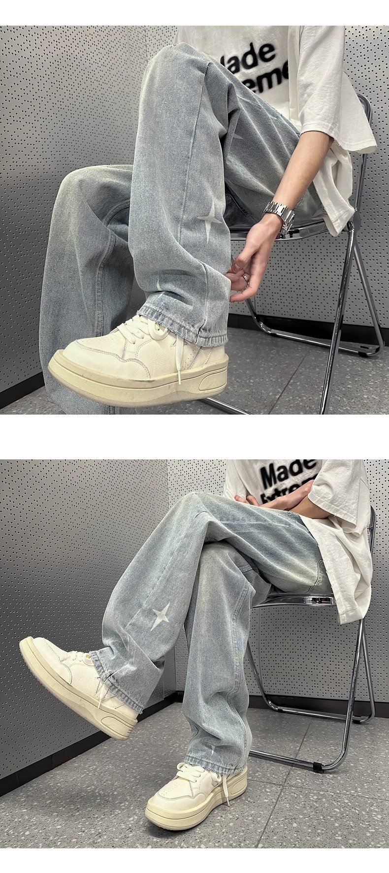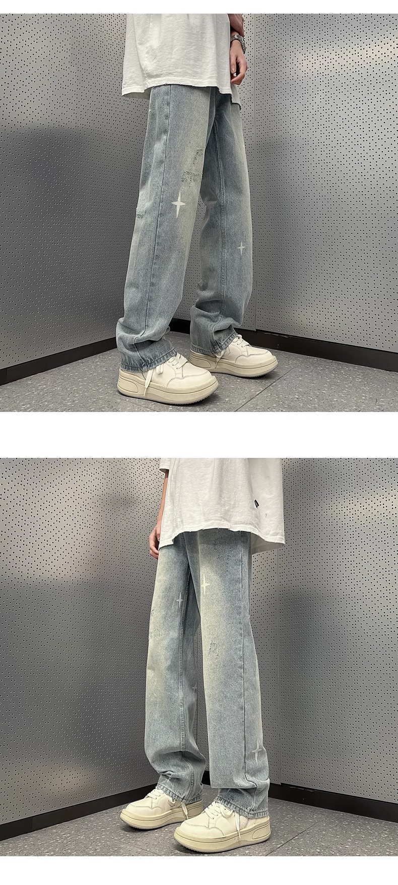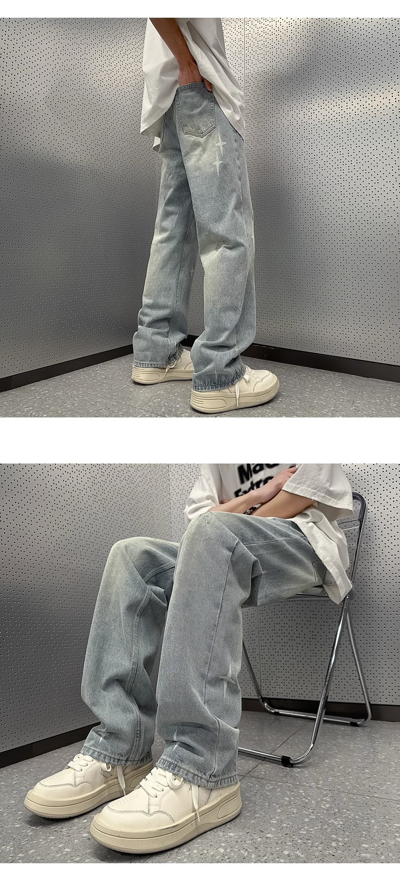Washed Light Blue Denim Pants Men Loose American Retro Hip Hop Streetwear Trendy Straight Leg Pants